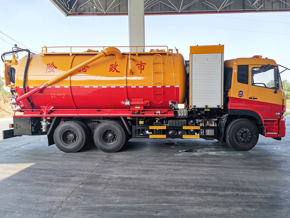 吸污部分:16方污罐,罐体8mmQ235优质碳钢,配潍柴420副发动机带淄博SK-42/258水循环泵,罐体内部平铺1.2米不锈钢底板,10米吸污管一根,进气管加过滤网,防溢阀加高,后盖卡扣锁紧,前视污量管,后尾部加装3个100mm的球阀吸污口,600mm排污口液压开启,150mm排污球阀,罐体带举升功能。