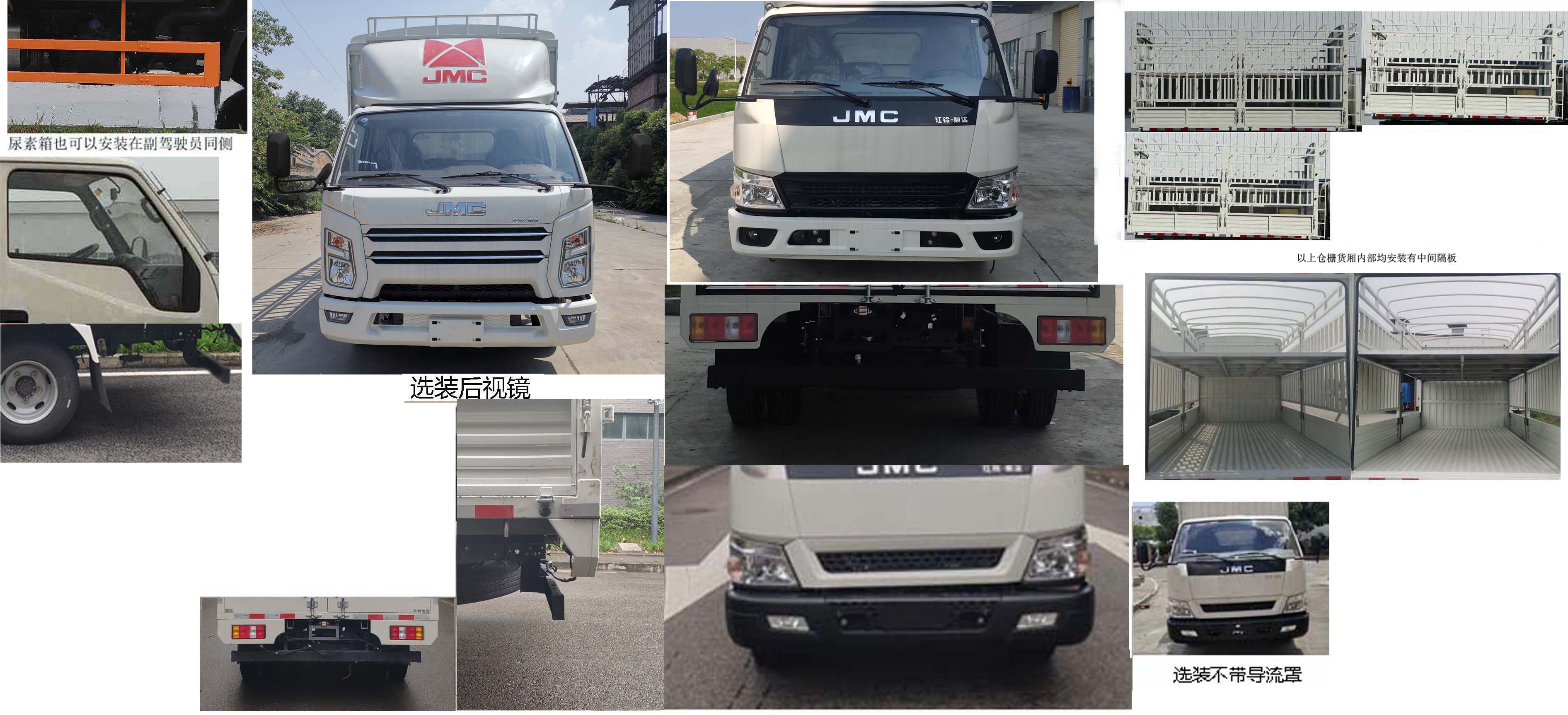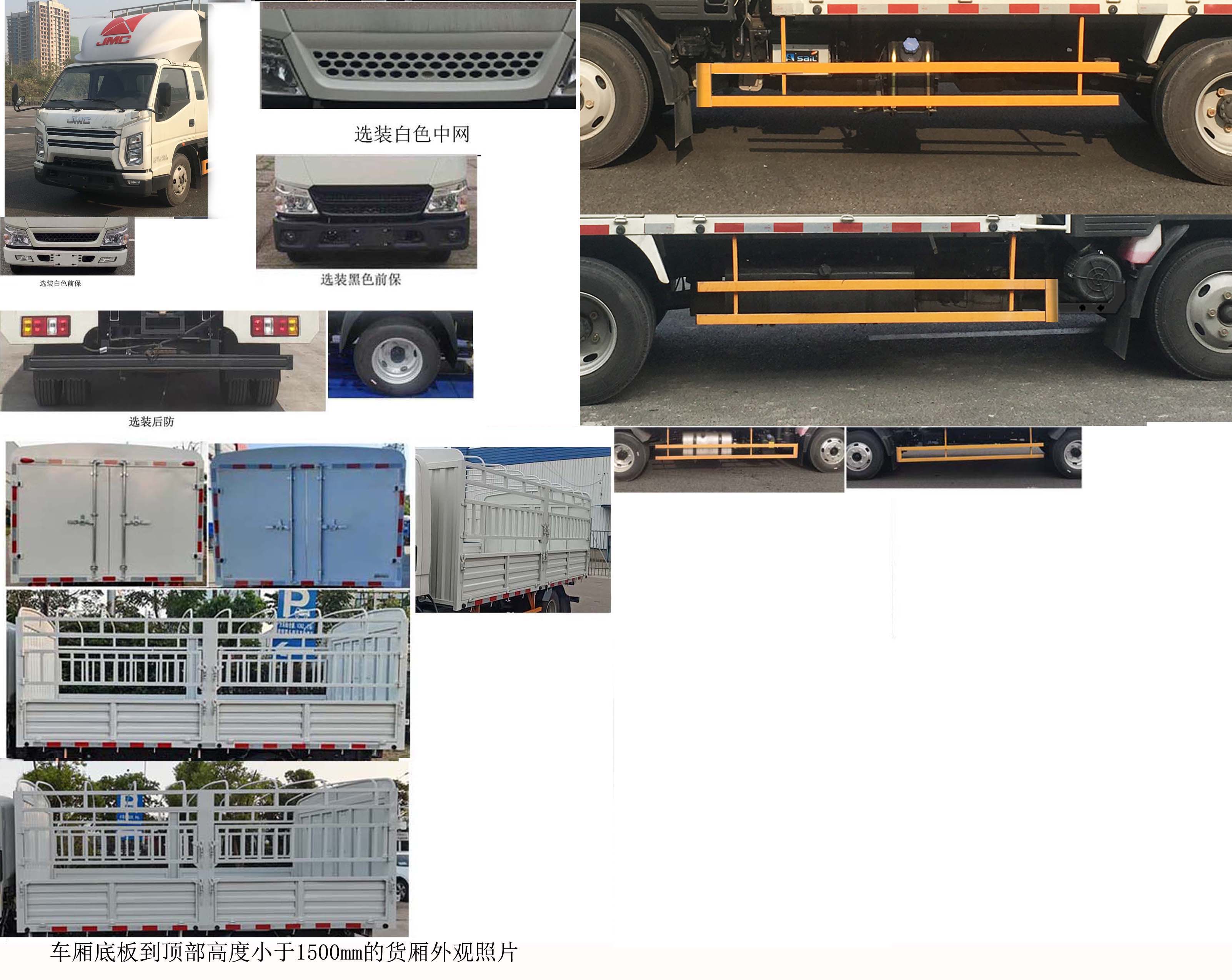 | 1、液刹ABS系统型号:APG3550500A,ABS系统生产厂家:浙江亚太机电股份有限公司;气刹ABS系统型号: VIE ABS-II,ABS系统生产厂家: 浙江万安科技股份有限公司。2、侧面防护装置材料:Q235,连接方式:螺栓连接;后下部防护装置材料:Q235,连接方式:螺栓连接,断面尺寸:100mm×45mm,离地高度:475mm/386mm。3、选装排半驾驶室及侧防护装置。可选装不带示廓灯。5、车厢底板到顶部高度为1495mm/2120mm/1770mm/1970mm/2150mm。选装货厢外观样式。随底盘选装后视镜。尿素可选择安装在副驾驶员同侧。随底盘选装前脸、前部灯具、尾部灯具,选装后防,选装的后下部防护装置材料:Q235,连接方式:螺栓连接,断面尺寸:120mm×45mm,离地高度:487mm;选装ABS系统型号:3550B500,ABS系统生产厂家:浙江亚太机电股份有限公司;选装铝合金轮毂。随底盘选装无备胎;选装货厢外观。扩展仓栅车内部隔层照片。导流罩可选择不安装。选装护轮板外观,JX4D2**6H发动机**净功率:103kw,对应油耗申报值:10.9L/100km.选装后防护,选装的后下部防护装置材料:HC700/980DP,连接方式:螺栓连接,断面尺寸:100mm×50mm,离地高度:473mm/386mm。发动机JX493ZLQ6D发动机**净功率:88kw,对应油耗申报值:10.9L/100km。发动机JX495ZLQ6C发动机**净功率:103kw,对应油耗申报值:10.9L/100km。随底盘扩展空滤、尿素箱和电瓶安装位置,整备质量不含备胎及灭火器、随车工具、三角垫木,货厢重量:533kg,539kg,544kg,货厢侧板材质/厚度:钢:1.2mm,1.5mm,货厢底板材质/厚度:钢:0.9mm,1.2mm,1.8mm,侧板和底板的钢材质对应厚度:DC01:0.9mm,1.2mm,1.5mm,1.8mm;HC420LA:0.9mm,1.2mm;Q235:1.5mm,1.8mm。发动机JX493ZLQ6F发动机**净功率:90kw,对应油耗申报值:10.9L/100km。 | |||