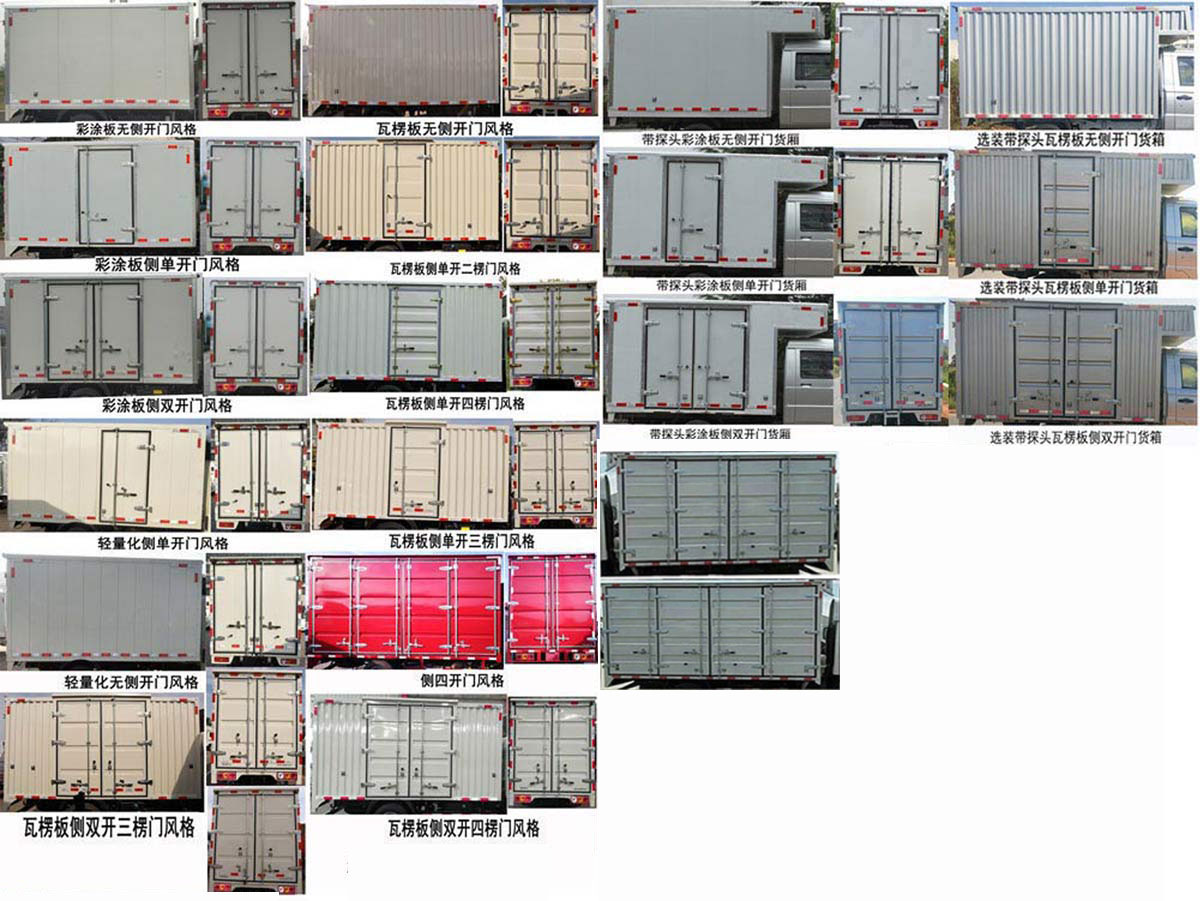 | 货厢顶部封闭,不可开启.ABS型号:YF9;ABS生产企业:武汉元丰汽车电控系统有限公司;选装描述:选装无侧开门彩涂板货厢,选装无侧开门瓦楞板货箱,选装侧单开门彩涂板货厢,选装侧单开门瓦楞板货厢,选装侧双开门彩涂板货箱,选装侧双开门瓦楞板货厢,选装双侧八开门风格货箱,选装后部灯具包围及新款号牌板,选装侧面四开门货厢;发动机/油耗值(L/100km)对应关系为:发动机HY4G15F对应的油耗值为9.5L/100km;该车型可选装ETC车载装置.该车型整备质量不包含备胎、灭火器、随车工具.货箱重量为475kg,底板材质为Q235钢,厚度为2.0mm,侧板材质为Q235钢,厚度为1.0mm;底板材质为Q235钢,厚度为2.0mm,侧板材质为Q235钢+聚苯乙烯复合板,厚度为40mm.选装无后防护装饰件,选装有侧防护装饰件,选装侧面四开门风格,选装不同无/单/双开门货厢风格,选装不同瓦楞货厢风格,选装不同瓦楞后部货厢风格,选装货厢加油便利缺口位置,选装反光膜货厢风格. | |||