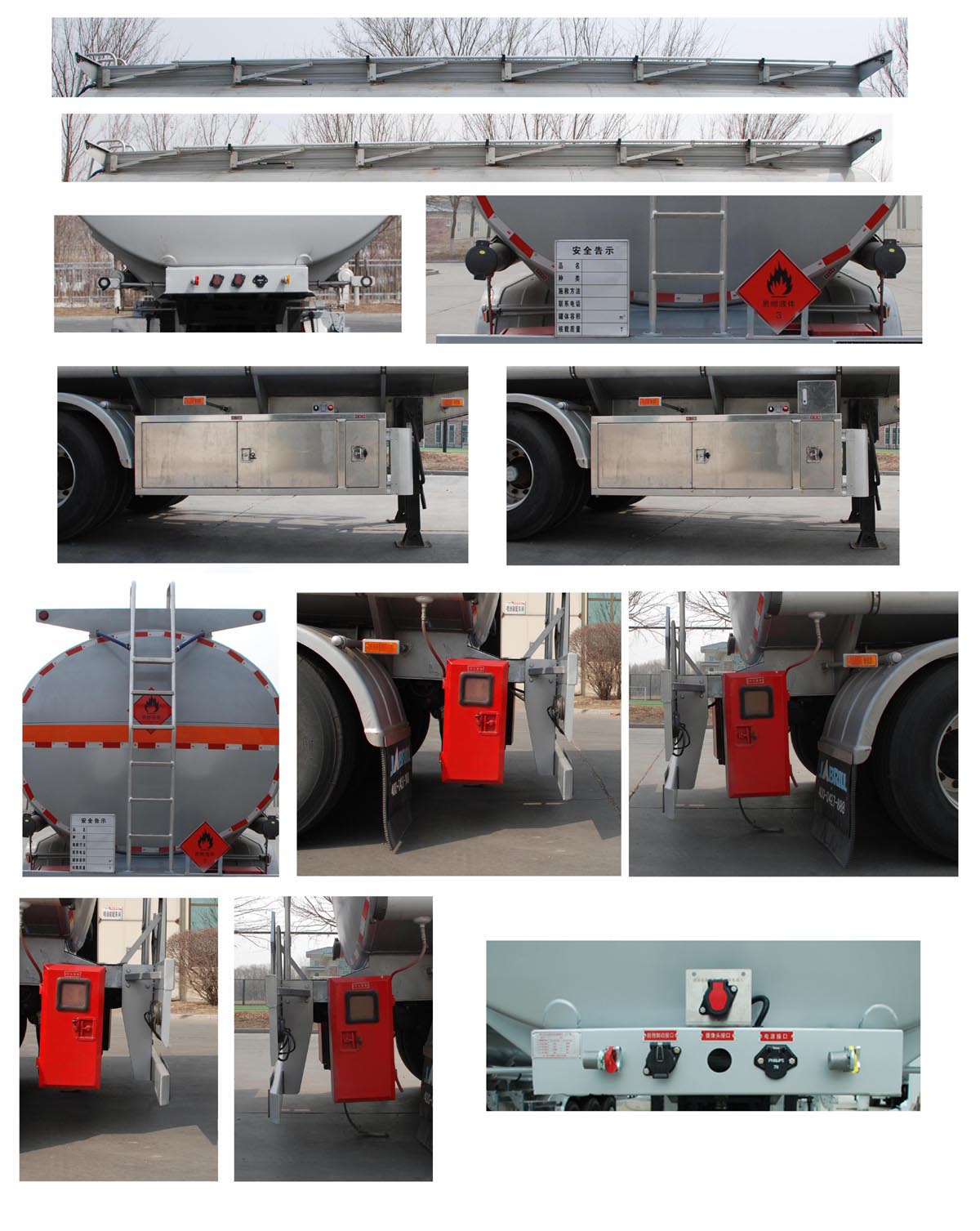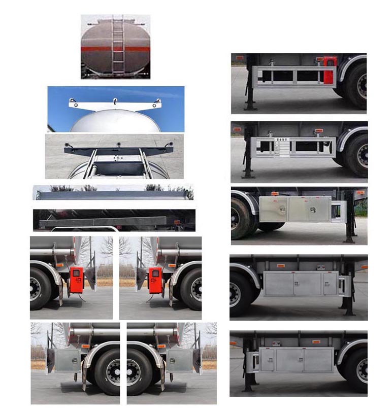 | 罐体总容量为35立方米,罐体有效容积33.53立方米.罐体外形尺寸:长度9250mm,宽度2490mm,高度1860mm(前)/2040mm(后),罐体为鹅颈式;准运介质的**密度为820千克/立方米.危险货物运输车辆的车辆类型:FL型车辆.选装罐顶走台结构,罐顶升降护栏样式,电气路罩板样式,软管箱及管盖样式,前爬梯位置,后爬梯样式,灭火器位置,工具箱位置及样式,工具箱门及阀箱门开启样式,安全告示牌位置,摄像头及安装位置,防溢流插座箱位置,双释放阀安装座位置,后部结构.ABS系统生产厂/型号:威伯科汽车**系统(**)有限公司/400500XXX0;广州瑞立科密汽车电子股份有限公司/CM2XL-4S/2M.EBS系统生产厂/型号:克诺尔商用车系统企业管理(上海)有限公司/K11061XVXX;威伯科汽车**系统(**)有限公司/4801020640.侧面防护装置材质:碳钢Q235B,连接方式:螺栓连接;后下部防护装置材质:碳钢Q235B,连接方式:螺栓连接,后下部防护装置的断面尺寸:150mm×50mm,离地高度为500mm.选装轻型车架结构时,整备质量为7300kg,额定载质量为27700kg.采用适用于牵引危险品运输半挂车的牵引车. | |||