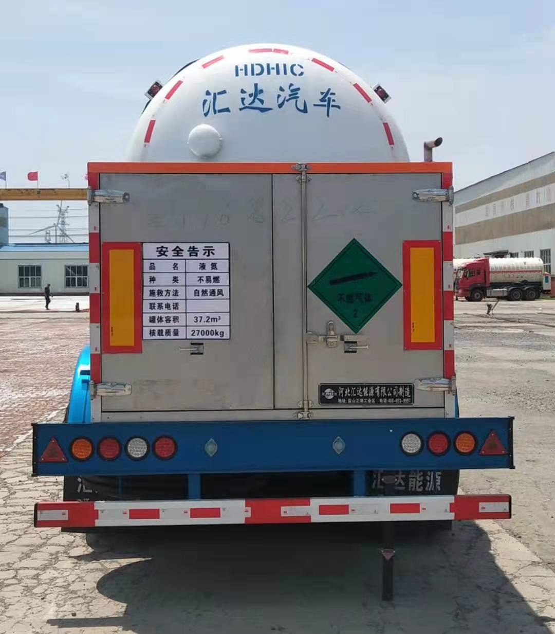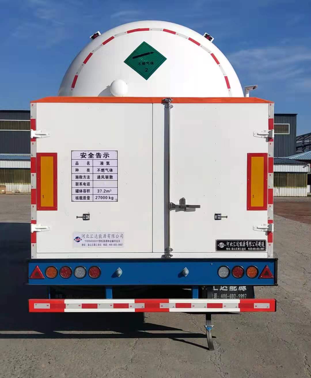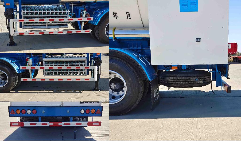 罐体有效容积:37.19立方米,罐体总容量:37.2立方米,罐体为双层结构,外罐尺寸(mm):2308x11469,内罐尺寸(mm):2111x11126 。充满介质:液氮,单位容积充装量725.9千克/立方米.AT型车辆.EBS系统的生产厂家为:威伯科汽车**系统(**)有限公司,EBS型号为:4801020300,选装ABS系统,生产厂家为:威伯科汽车**系统(**)有限公司,ABS型号为:4005000880.侧防护装置材料为6063T5,连接方式螺栓连接,后面防护装置材料为Q23**.连接方式为焊接,后部防护装置的尺寸(长x宽)120x60(mm): 后防护离地高度390mm,采用适用于牵引危险品运输半挂车的牵引车.选装不锈钢后阀门箱