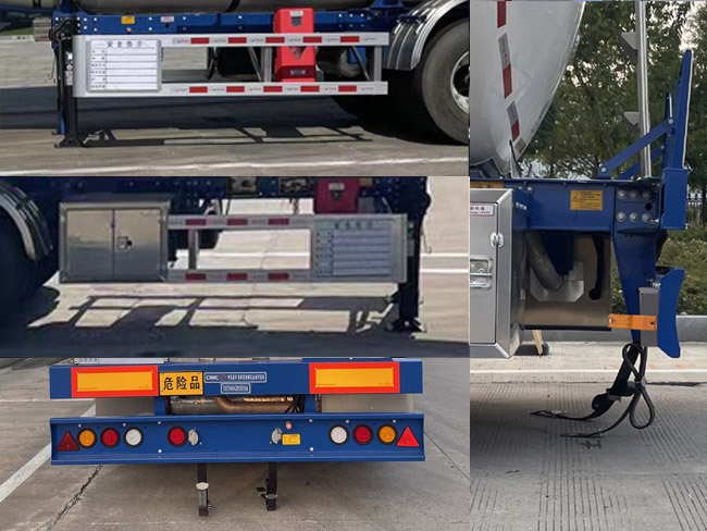 罐体有效容积36.2立方米,罐体总容量38立方米.罐体外形尺寸(mm):保温层厚度为50,保温外罐长11548外径前φ2060后φ2260,保温内罐长11388外径前φ1960后φ2160.危险货物运输车辆的类型为:FL型,准运介质的**密度为882千克/立方米.该车装空气悬架.EBS厂家,型号:克诺尔商用车系统企业管理(上海)有限公司,K11061XVXX或瀚德汽车产品(苏州)有限公司,4S2M或威伯科(上海)管理有限公司,4801020640或浙江万安科技股份有限公司,VIE TEBS-I或广州瑞立科密汽车电子股份有限公司,CM-TEBS.侧防护材料为铝合金,螺栓连接;后防护材料为610L,螺栓连接.后防护断面尺寸80×300mm,离地高480mm.该车为危险货物运输车辆,采用适用于牵引危险品运输半挂车的牵引车.