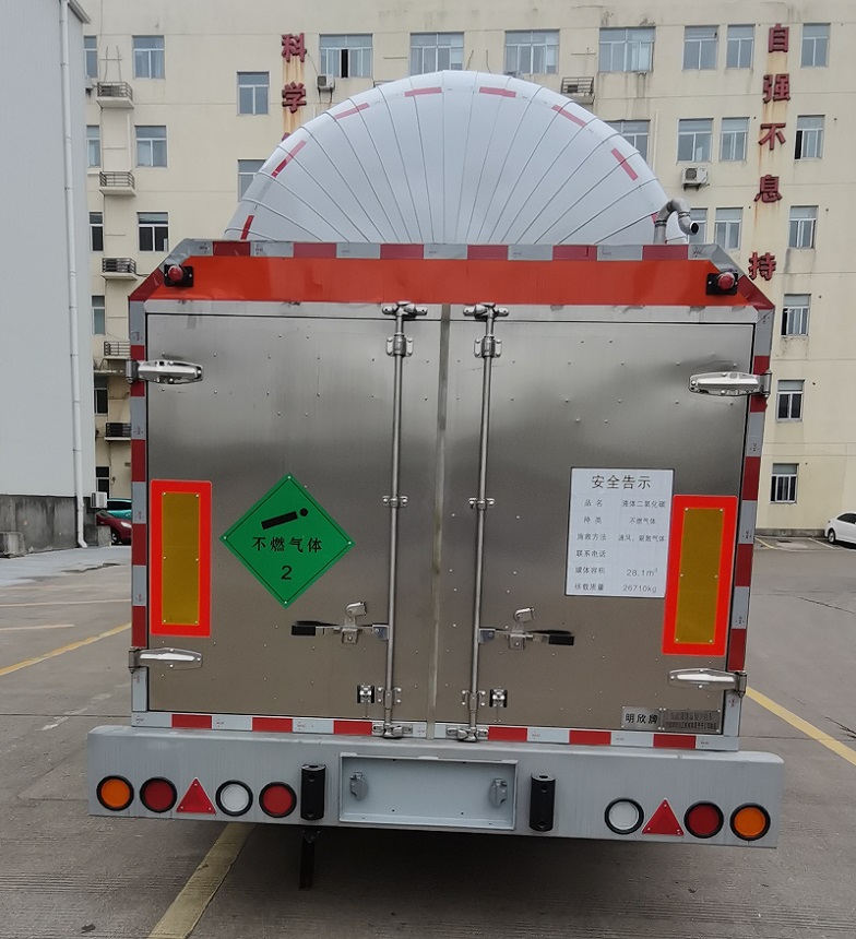 | 危险货物运输车辆的车辆类型:AT型.罐体外形尺寸:Φ2255×11900,内罐尺寸:Φ1873×10840.罐体总容量28.1立方米,有效容积26.1立方米.装载介质为液态二氧化碳,类项号2.2. 单位容积充装质量为952千克/立方米.仅选用子午线真空胎.EBS型号/厂家:CM-TEBS/广州瑞立科密汽车电子股份有限公;侧防护材质:铝合金6063;连接方式:螺栓焊接.后下防护材质:Q235B,连接方式:焊接;断面尺寸: 330mm×100mm;离地高度:445mm.采用适用于牵引危险品运输半挂车的牵引车.装备空气悬挂. | |||
