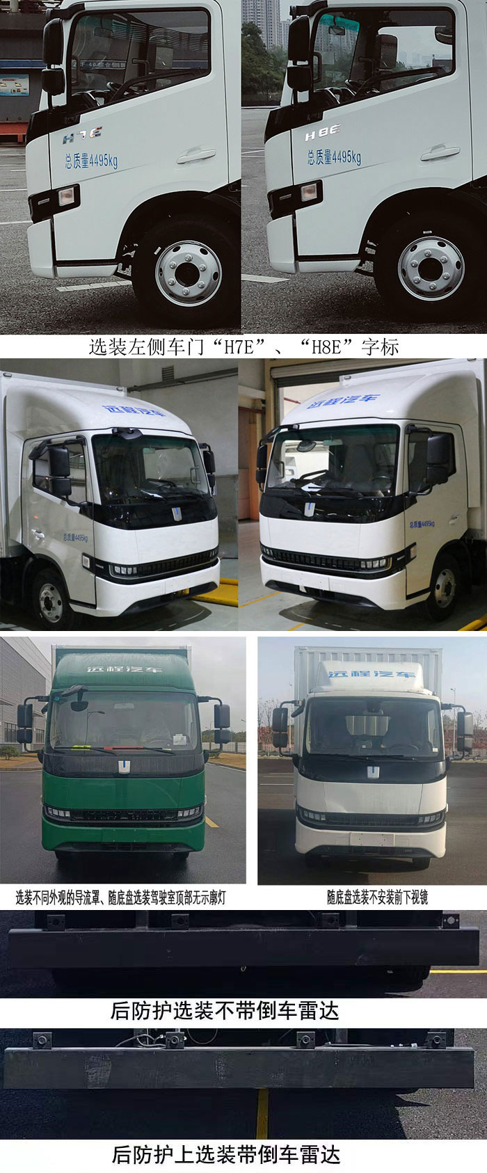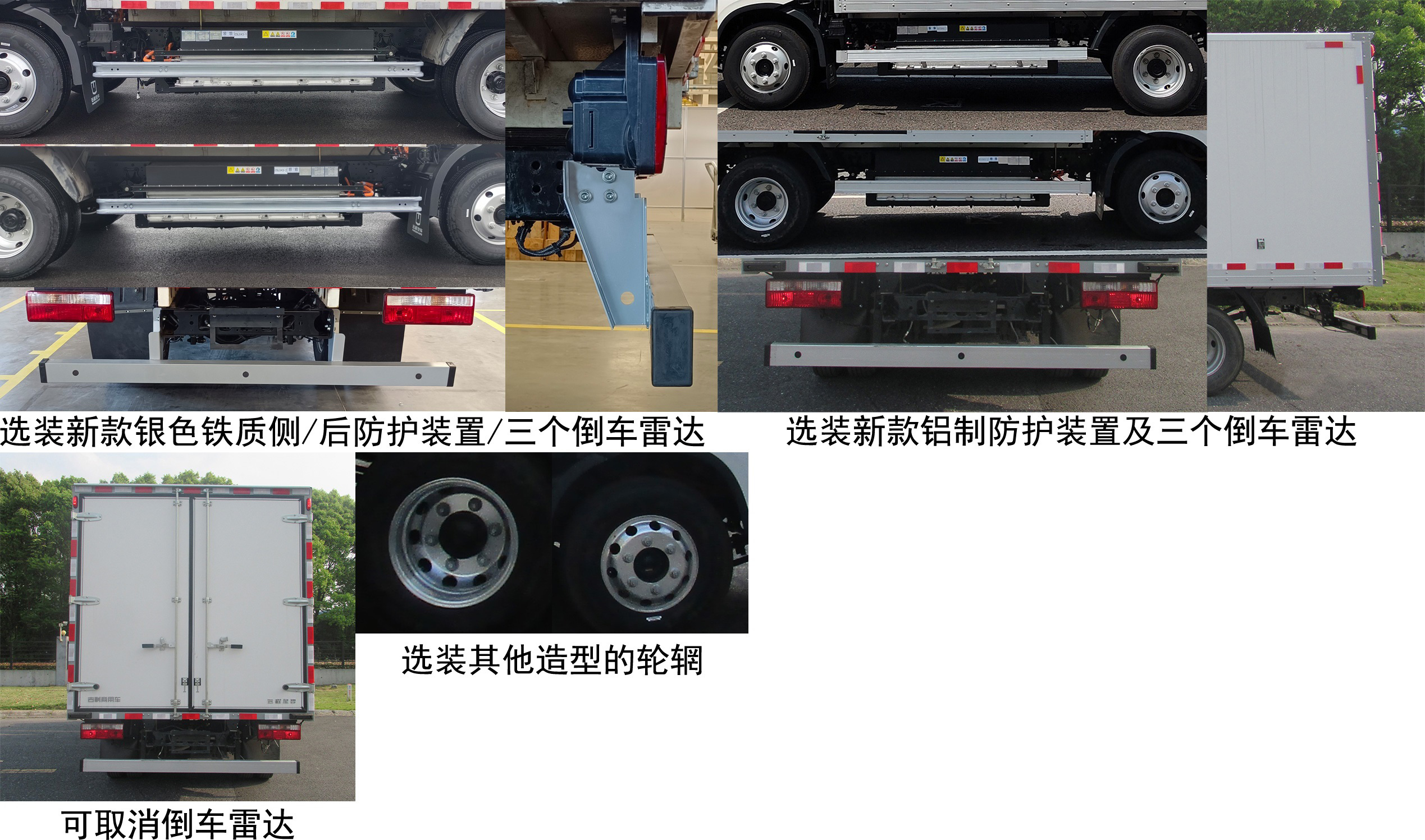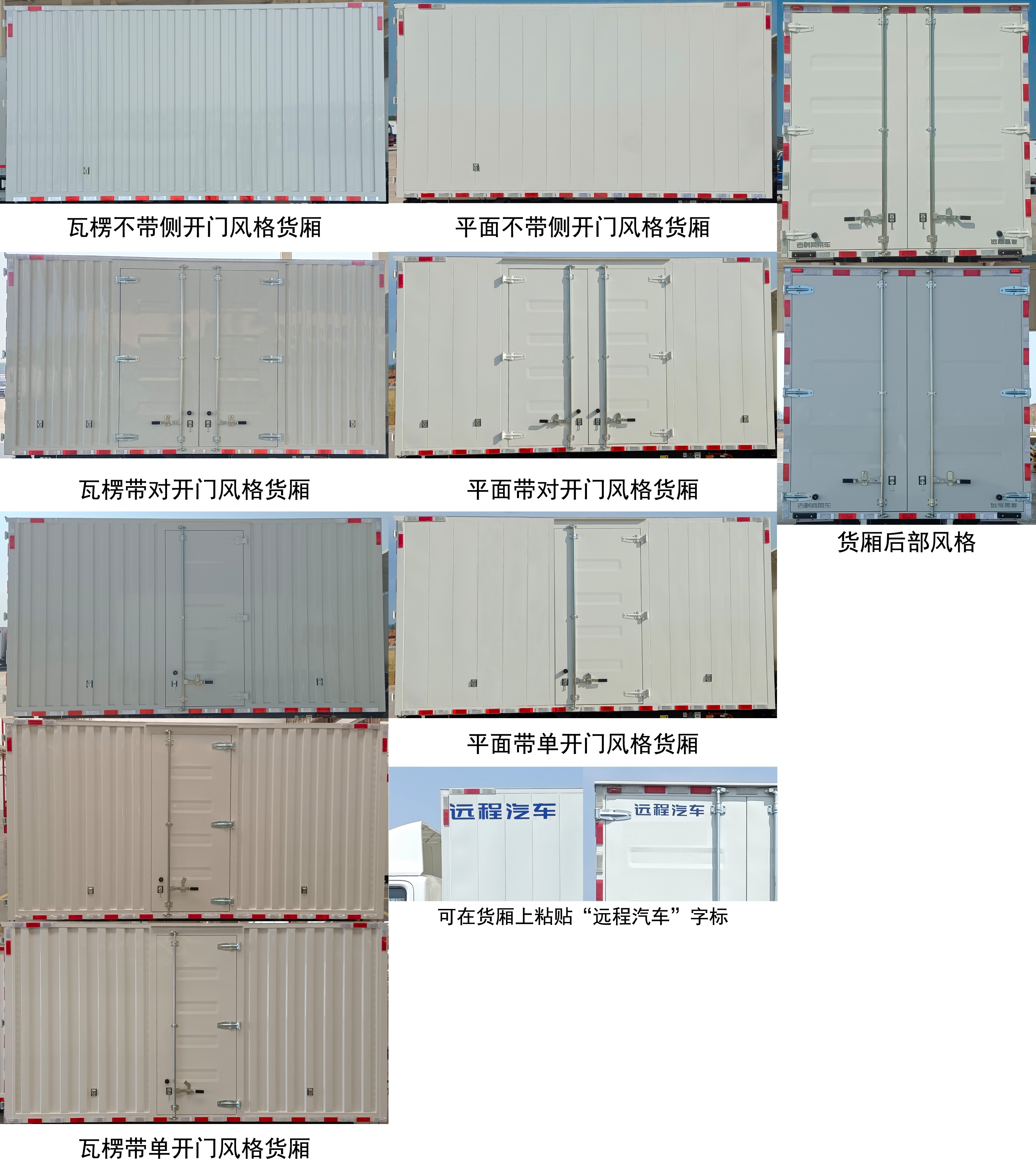 | 1.储能装置种类/生产企业:磷酸铁锂蓄电池/湖北亿纬动力有限公司;2.驱动电机额定功率/峰值功率:65kW/120kW;3.ABS型号/生产企业:YF8/武汉元丰汽车电控系统股份有限公司;4.选装ETC车载装置;5.车厢顶部封闭不可开启;6,侧面防护装置材料为Q235,连接方式:螺栓连接,左右侧防护结构一致;后下部防护装置材料为Q235,连接方式:螺栓连接,后下部防护装置断面尺寸(mm):150×53,离地高度(mm):422;7,可选装带“远程汽车”字标的不同外观的导流罩;8.可随底盘取消驾驶室示廓灯,前下视镜,选装左侧车门“H7E”“H8E”字标;9.可选装不同风格货厢,选装瓦楞不带侧门/带单侧门/带对开门的厢体,可选装平面不带侧门/带单侧门/带对开门的厢体,选装货厢后部风格,厢体上选装不同位置的缓冲块;10,可选装倒车雷达;11.货厢重量(kg):500,610,650,600,630,660,680,货厢材质:底板(Q550),侧板/前板(Q700),顶板/厢体门(铝合金AL5052);货厢材料截面厚度(mm):底板(1.5/1.8),侧板/顶板/前板(0.8),顶板(1.0),厢体门(1.2);12.整备质量对应的配件配备情况:不包括备胎,包含灭火器及随车工具;13,货厢内部高度(mm)1950,2100和整车高度(mm)2980,3130一一对应;14,整车整备质量(kg)3000时:额定载质量(kg)1365,1300与驾驶室准乘人数(人)2,3一一对应;整车整备质量(kg)3150时:额定载质量(kg)1215,1150与驾驶室准乘人数(人)2,3一一对应.15.选装其他造型的轮辋;16.选装新款银色铁质侧/后防护装置,侧防护装置材料为Q235,连接方式:螺栓连接,左右侧防护结构一致,后下部防护装置材料为Q235,连接方式:螺栓连接,后下部防护装置断面尺寸(mm):100×50,离地高度(mm):422;17.选装铝制防护装置,侧防护装置材料为AL6061,连接方式:螺栓连接,左右侧防护结构一致,后下部防护装置材料为AL6061,连接方式:螺栓连接,后下部防护装置断面尺寸(mm):100×50,离地高度(mm):422;18.选装三个倒车雷达;18.可选装不带倒车雷达;19,可在货厢上粘贴“远程汽车”字标. | |||