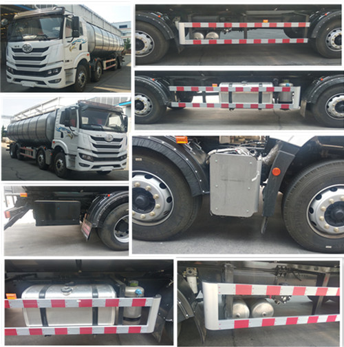 | 罐体总容量为:19.6立方米,有效容积为:18.5立方米,罐体外部尺寸为:长 8360mm,长轴: 2440mm,短轴: 1790 mm;运输介质为: 鲜奶, 密度:1000千克/立方米;罐体含保温层,层厚120mm;侧防护材料:铝合金5083,后防护材料:Q235,连接方式均为:螺栓连接。后防护断面尺寸50mm×120mm。后防护离地高度:475mm;该车型可选装ETC 车载装置。随底盘选装驾驶室,随底盘选装油箱,尿素壶,储气筒位置,选装油滤位置,三元催化器尾气后处理位置;选装侧面防护样式和工具箱位置.该车安装限速装置,限速89km/h.第三轴悬架型式为钢板弹簧和空气悬架复合式,不可提升. ABS生产厂家:浙江万安科技股份有限公司,ABS型号:VIE ABS-II;该车安装具有卫星定位功能的行驶记录仪;油耗对应关系(L/100km):CA6DLD-26E6(37.0);CA6DLD-29E6(37.0) | |||