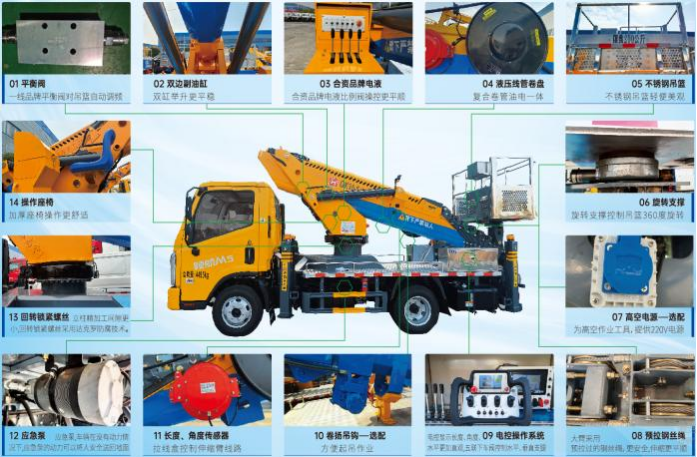 | 双变幅油缸:加大加粗,举升更平稳,还加装了防爆阀,为高空安全保驾护航 |