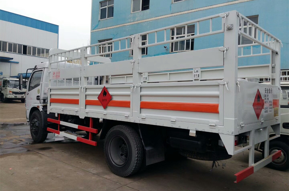 该车适用于运输危险品。用于运输具有**容器(瓶)包装的易燃气体(类项号:2.1):液化石油气,压缩甲烷或甲烷含量高的压缩天然气,乙炔,乙烷,丁烷,丙烯,丁烯,二甲醚,压缩氧;用于运输具有**容器(瓶)包装的非易燃无毒气体(类项号:2.2):二氧化碳,压缩氧(氮,空气,氦,氩,氖)。防护材料:Q23**碳钢,连接方式:左右侧面及后部防护均采用焊接连接,后部防护断面尺(mm):**×50, 后部防护离地高度(mm):500。仅采用底盘子午线轮胎和带ABS的底盘,该车前轮安装盘式制动器,前置排气管,装配限速装置,限速80km/h。安装带有卫星定位功能的行驶记录仪。ABS系统生产厂家及型号:襄阳东风隆诚机械有限责任公司,ABS/ASR-24V-4S/4M。随底盘选装前面罩,前保险杠,前组合灯具。上装可选装无栅栏。后部液压尾板收起状态的水平长度是250mm。危险货物运输车辆的车辆类型(FL型车辆)。 |