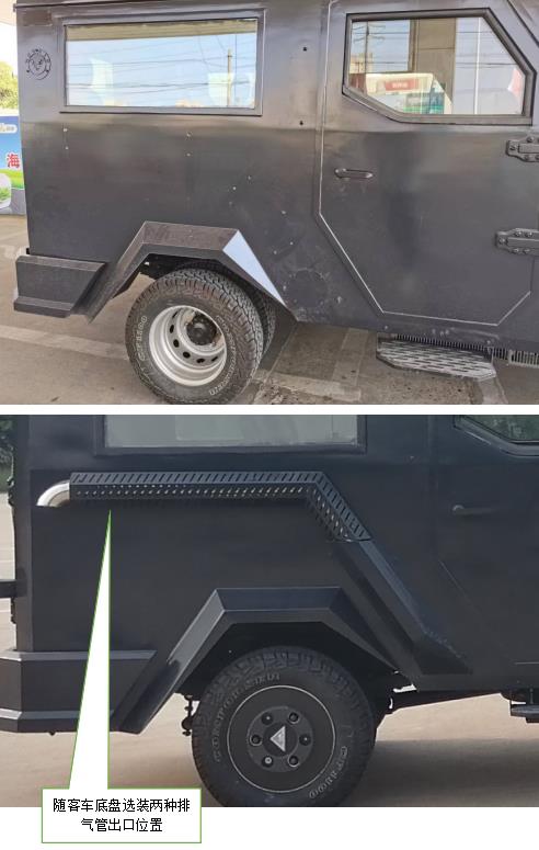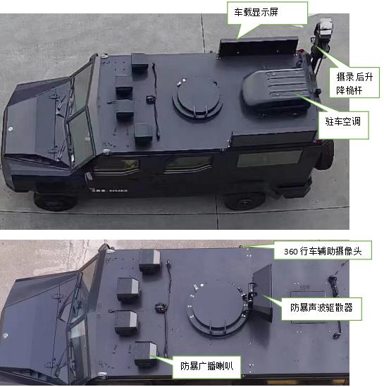| 整车ABS型号和厂家为:ESP9/博世汽车部件(苏州)有限公司; F1CE8481K发动机**净功率为:123kW;装有卫星定位功能的行驶记录仪,可选装ETC车载装置,该车随客车底盘选装排气管出口位置和360行车**系统。该车不作为公路客车、旅游客车使用,主要专用装置:防暴广播喇叭,电器柜;安装防暴广播喇叭,电器柜,车长5605mm,高度2545mm,整备质量4450kg;选装后部两侧车载显示屏、安装防暴广播喇叭、电器柜,车长5605mm,高度2660mm,整备质量4550kg;选装后部两侧车载显示屏、声波驱散器、驻车空调、安装防暴广播喇叭、电器柜,车长5605mm,高度2760mm,整备质量4650kg;选装后部两侧车载显示屏、摄录后升降桅杆、驻车空调、安装防暴广播喇叭、电器柜,车长5645mm,高度2950mm,整备质量4850kg。 | |||