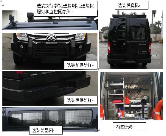 | 该车主要专用装置有:防暴防护网,前后保险杠,探照灯,监控摄像头,喇叭功放系统等,该车装备行驶记录仪,不作为公路客车,旅游客车使用.随整车选装外摆门、左侧移门、推拉侧车窗、侧踏步、牌照装饰板、前格栅、尾标、轮圈、轮饰盖、外摄像头.可选装有卫星定位功能的行驶记录仪和限速装置.发动机ECU限速,限速100km/h.装备的ABS系统,ABS型号/厂家:ABS 9.0/博世汽车部件(苏州)有限公司.选装装备柜,防暴网,样车5座,不带车顶平台及车顶设备时,样车长度5785mm,整备质量为2670kg,高度2345mm,前悬为865mm,后悬为1070mm.选装前后保险杠,防暴网,车顶平台,装备柜,后爬梯,6座,长度5900mm,整备质量为2750kg,高度2490mm,前悬为950mm,后悬为1100mm.选装前后保险杠,防暴网,车顶平台,探照灯及监控摄像头,后爬梯,装备柜,7座,长度5900mm,整备质量为2860kg,高度2630mm,前悬为950mm,后悬为1100mm.选装前后保险杠,防暴网,车顶平台,顶爬梯,探照灯及监控摄像头,装备柜,后爬梯,8座,长度5900mm,整备质量为2980kg高度2630mm,前悬为950mm,后悬为1100mm.选装前后保险杠,防暴网,车顶平台,顶爬梯,探照灯及监控摄像头,广播喇叭,后爬梯,装备柜,9座,长度5900mm,整备质量为3060kg,高度2720mm,前悬为950mm,后悬为1100mm.发动机**净功率100.5KW. | |||