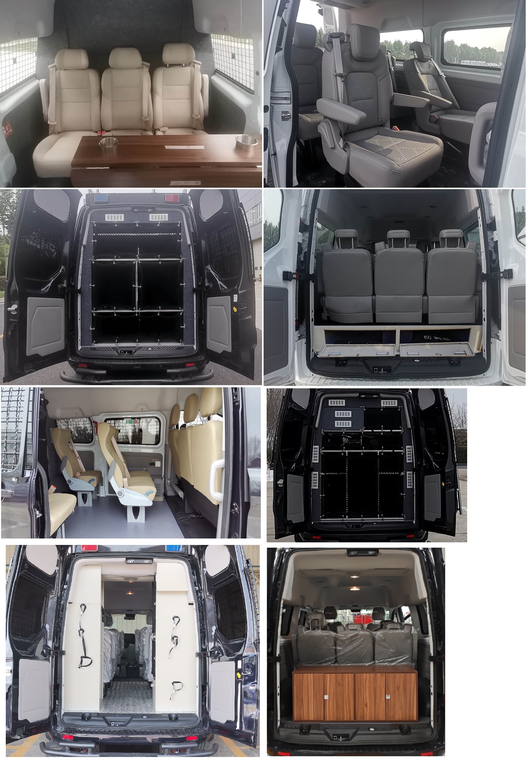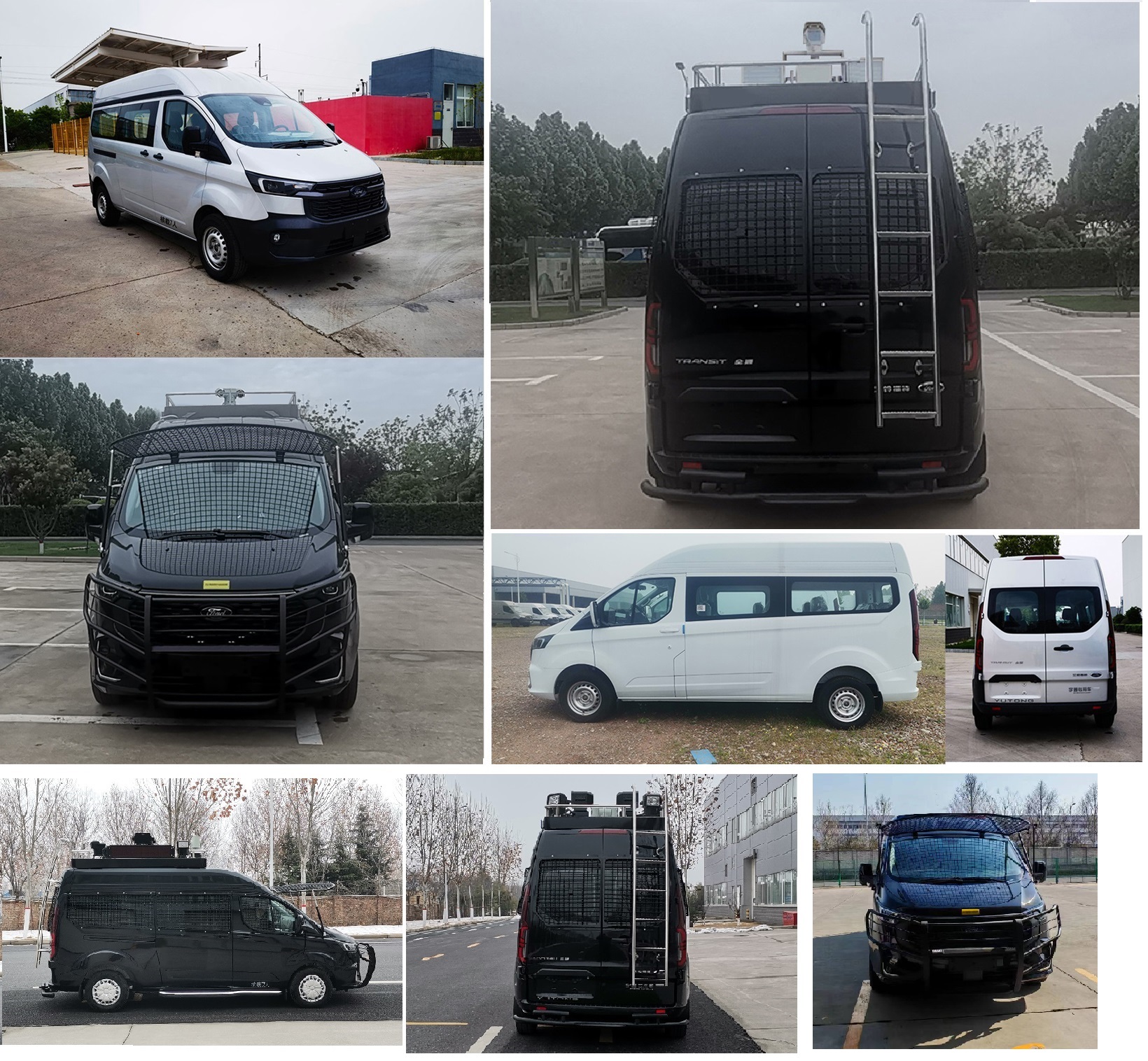 | 1.该车配备器械存放柜,用于特种人员的运送;2.安装前后防撞杠时车长为5771mm,对应前后悬为1204mm/1267mm,对应整车接近角/离去角为12°/14°;3.该车仅选用底盘中顶状态,整车高度对应关系:**车顶高度为2375mm,**车顶平台护栏高度为2640mm,顶LED屏高度为2700mm,**云台摄像机、后爬梯的高度为2800mm,**车顶声波驱散器喇叭高度为2880mm;4.整备质量对应关系:低配时整备质量为2350kg,标配时整备质量为2490kg,高配时整备质量为2640kg或2700kg;5.该车可选装升降照明灯、云台摄像机、前后防撞杠、防暴网、车顶平台、后爬梯;可选装不同样式防爆网撑杆;可选装不同样式装备柜;整车座位可通过不同的座椅组合方式完成;6.可随原车选装前格栅,前保,轮辋,侧踏步,尾门,前大灯,后尾灯,门把手;7.ABS系统**器型号:ESP9,生产厂:博世汽车部件(苏州)有限公司;8.发动机**净功率为160kW(ECOBOOST4G20C6L);9.该车配备汽车事件数据记录系统(EDR),直接供电式ETC车载装置;10.车顶外覆盖件**离地高度(mm):2375,2640,2800;11.选装前防爆网时安装举升装置,在行驶状态下处于举升状态,不影响视野. | |||