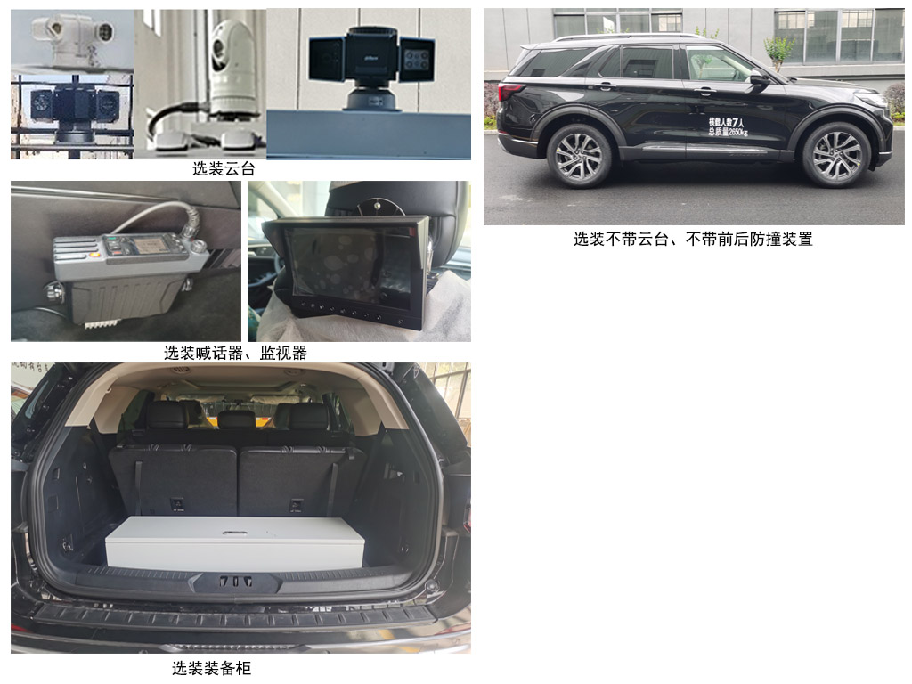 | 1.该车辆装备:数字高清一体化云台摄像机,车载视频监控传输系统等,用于特种人员的运送;选装云台,选装装备柜;选装喊话器,监视器,可选装不带云台,不带前后防撞装置;2.选用CAF6510B65E,发动机:CAF488WQGA,**净功率:201kW,油耗值9.74L/100km;选用CAF6510B66E,发动机:CAF488WQGA,**净功率:201kW,油耗值10.08L/100km;3.ABS系统型号:L1MC-2D335-**,ABS系统生产厂家:Continental;4.随原车选装:前格栅造型、前格栅上饰条、暗铬前保饰件、黑色前保下饰件、不带前部EXPLORER标识、前部黑色EXPLORER标识、不带前置摄像头、暗铬饰条前组合灯、不带前部雷达、不带前部侧雷达、暗铬饰条贯穿式后组合灯、黑色后部EXPLORER标识、黑色后保下装饰件、不带饰条的尾门槛防擦装饰件、侧部ST-Line标识、黑色侧裙装饰条、不带饰条门把手或黑色饰条门把手、黑色行李架、轮辋、不带摄像头外后视镜底座、不带后部侧雷达、车身同色车顶;4.该车型可选装ETC车载装置;该车配备汽车事件数据记录系统(EDR)。 | |||